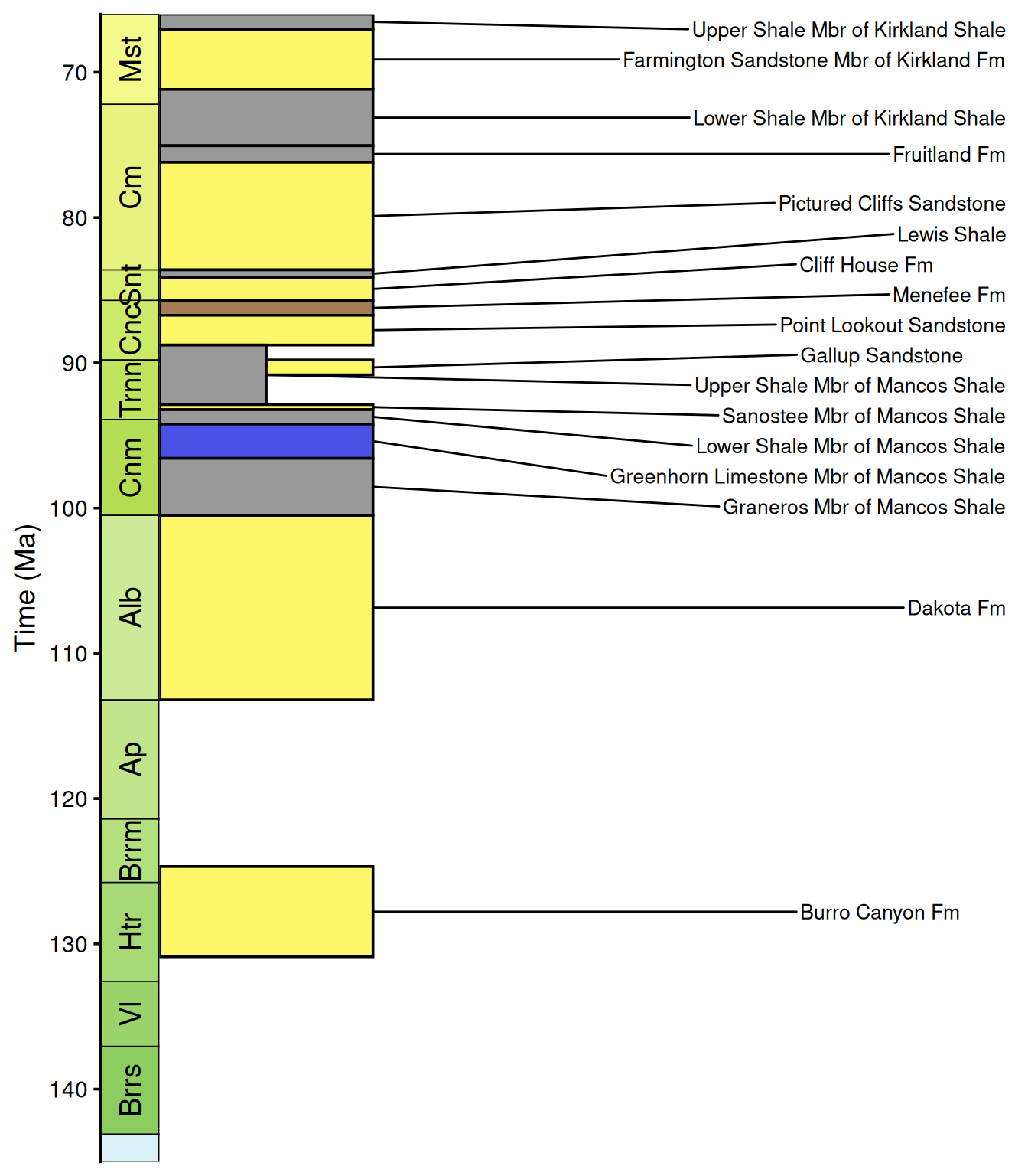 The rmacrostrat package allows users to access the Macrostrat API, which includes various geological data (e.g., lithostratigraphic units) and definitions/metadata associated with those data. The package includes a number of vignettes that walk through how to retrieve and visualize various types of data from the database. Here, we’re going to be plotting a stratigraphic column for the San Juan Basin, a large structural depression which spans parts of New Mexico, Colorado, Utah, and Arizona. The details about downloading this data are thoroughly presented in this rmacrostrat vignette. For the purposes of this deeptime vignette, we’ll skip ahead and download the unit-level stratigraphic data for this basin during the Cretaceous: