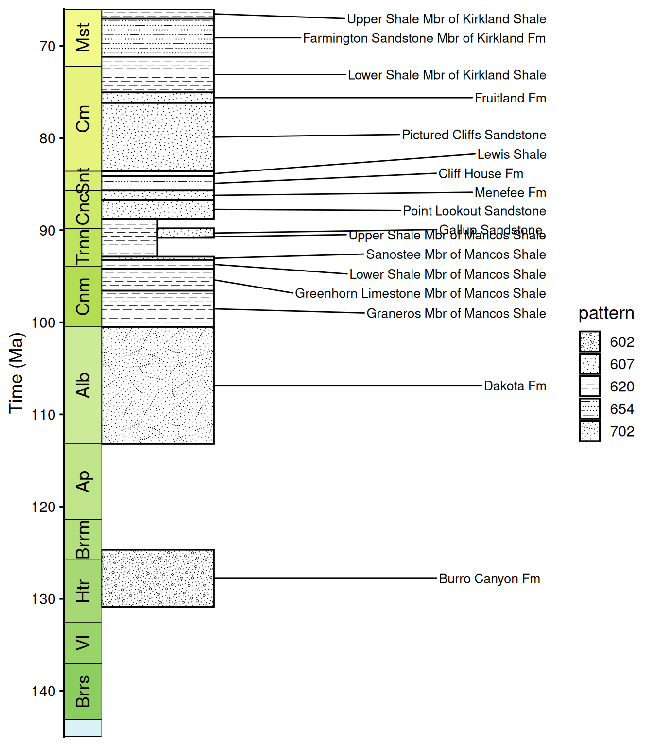 The rmacrostrat package allows users to access the Macrostrat API, which includes various geological data (e.g., lithostratigraphic units) and definitions/metadata associated with those data. The package includes a number of vignettes that walk through how to retrieve and visualize various types of data from the database. Here, we’re going to be plotting a stratigraphic column for the San Juan Basin, a large structural depression which spans parts of New Mexico, Colorado, Utah, and Arizona. The details about downloading this data are thoroughly presented in this rmacrostrat vignette. For the purposes of this deeptime vignette, we’ll skip ahead and download the unit-level stratigraphic data for this basin during the Cretaceous: