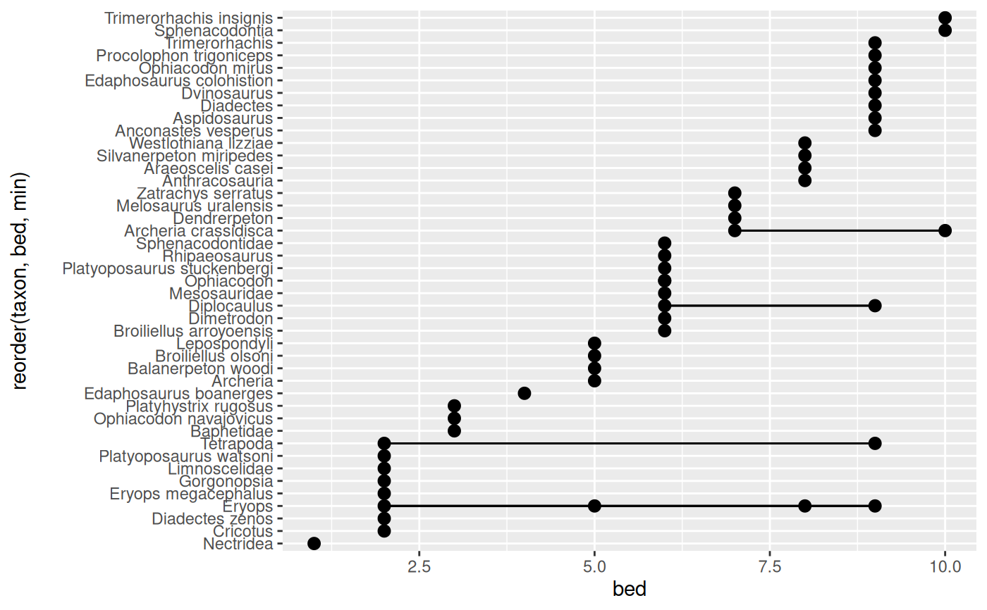 ggplot(occdf, aes(y = reorder(taxon, bed, min), x = bed)) +